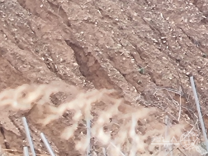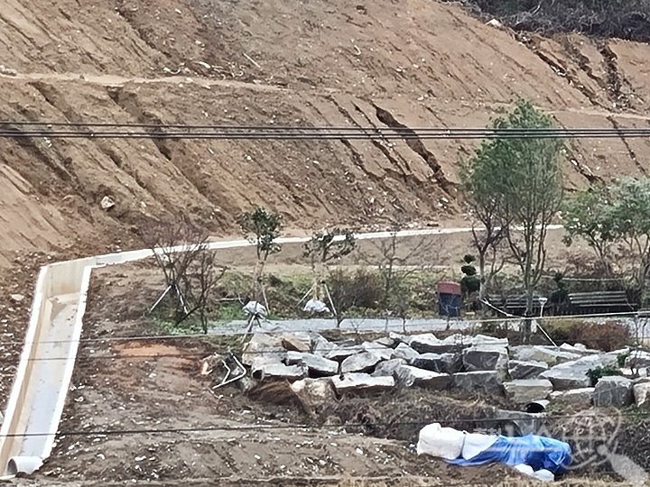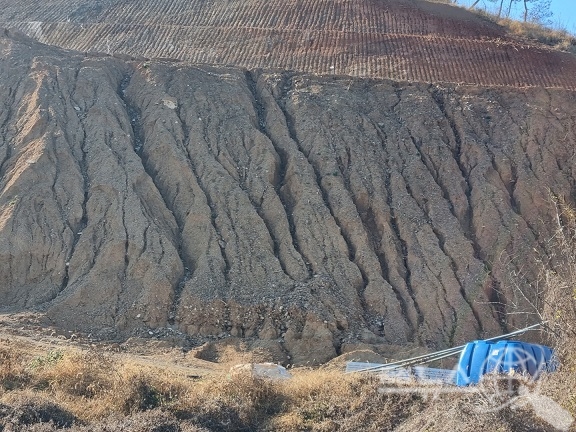 토사가 유실된 곳은 농경지와 창고가 접해있는 곳으로, 시공사 포스코 는 비탈면에 다짐을 덜한 상태에서 눈․우기대비와 비산먼지 대책에 무방비한 상태다.