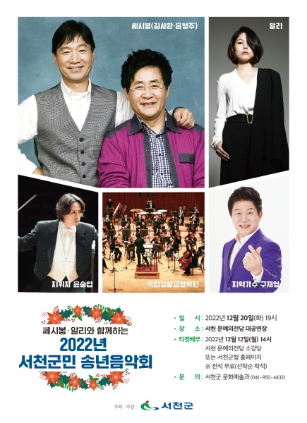 [충청뉴스큐] 서천군이 오는 20일 19시 서천 문예의전당 대공연장에서 ‘쎄시봉과 알리가 함께하는 2022년 서천군민 송년음악회’가 열린다고 1일 밝혔다.