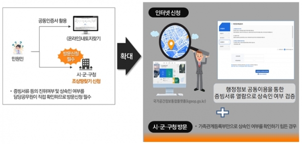 현재까지 땅 찾기를 원하는 민원인은 사망한 가족과의 상속여부를 확인할 수 있는 증빙서류인 제적등본, 기본증명서 또는 가족관계증명서 등을 지참하고 지자체에 방문해야하나 온라인 조상땅 찾기 서비스는 방문할 필요 없이 K-Geo 플랫폼, 국가공간정보포털, 정부24에서 간단하게 신청할 수 있다.