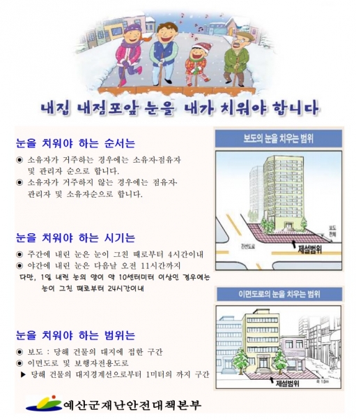 ‘내 집·내 점포 앞 눈 치우기 운동’은 ‘예산군 건축물관리자의 제설 및 제빙 책임에 관한 조례’에 따라 추진된다.