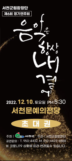 서천군립예술단장인 김성관 부군수는 “연말을 맞아 이번 정기연주회를 함께 감상해 따뜻하고 행복한 시간이 되시길 바란다”고 전했다.