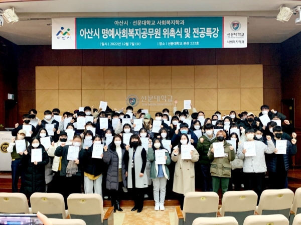 [충청뉴스큐] 아산시가 지난 7일 선문대학교 사회복지학과 학생 등 80여명을 대상으로 통합사례관리 특강을 진행하고 명예 사회복지공무원으로 위촉했다.