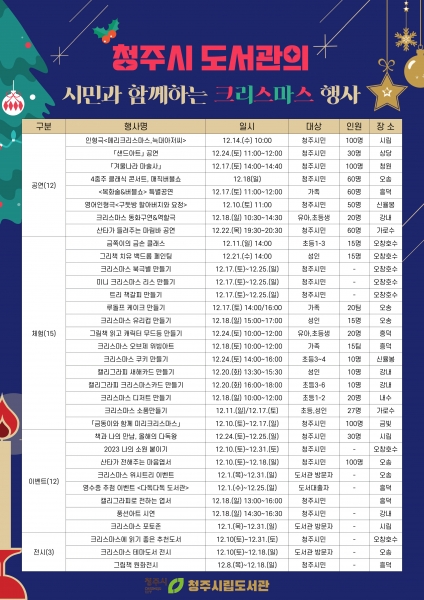 [충청뉴스큐] 청주시 도서관은 다가오는 크리스마스를 맞아 가족이 함께 즐길 수 있는 다양한 공연과 체험 프로그램을 마련했다고 9일 밝혔다.