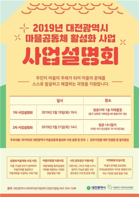 대전시가 오는 19일과 21일 마을의 다양한 공동체그룹을 대상으로 ‘2019 마을공동체 활성화사업 사업설명회’를 개최한다“고 17일 밝혔다. 설명회는 사업의 세부적인 내용과 사업비 집행기준에 대한 상세한 내용을 안내하며, 19일 오전 10시 청춘다락 (동구 선화로 196번길 48 1층)과 21일 오후 2시 청춘너나들이(서구 둔산중로 19 샤크존 2층)에서 각각 개최된다. 2019 마을공동체 활성화사업은 주민이 마을의 문제를 스스로 발굴하고 해결하는 과정을 지원하는 사업으로 모두 13억 원의 예산이 지원된다. 사업전체는 주민이 마을의 문제를 발견, 함께 참여하고, 협의하는 과정을 거쳐 사업을 진행할 수 있는 마을민주주의 실현하는 과정으로 진행된다. 지원사업은 모두 4개로 ▲ 공동체 마을계획수립사업 ▲ 마을리빙랩사업 ▲ 시민공유공간사업 ▲ 지역화폐조성사업으로 구성돼 있다. 대전시 관계자는 “동아리형태의 마을공동체에서 더 나아가 직접 동 주민센터, 중간지원조직 활동가, 전문가와 함께 직접 마을의 문제를 해결하는 데 마을 공동체가 적극 참여하길 바란다”고 말했다.