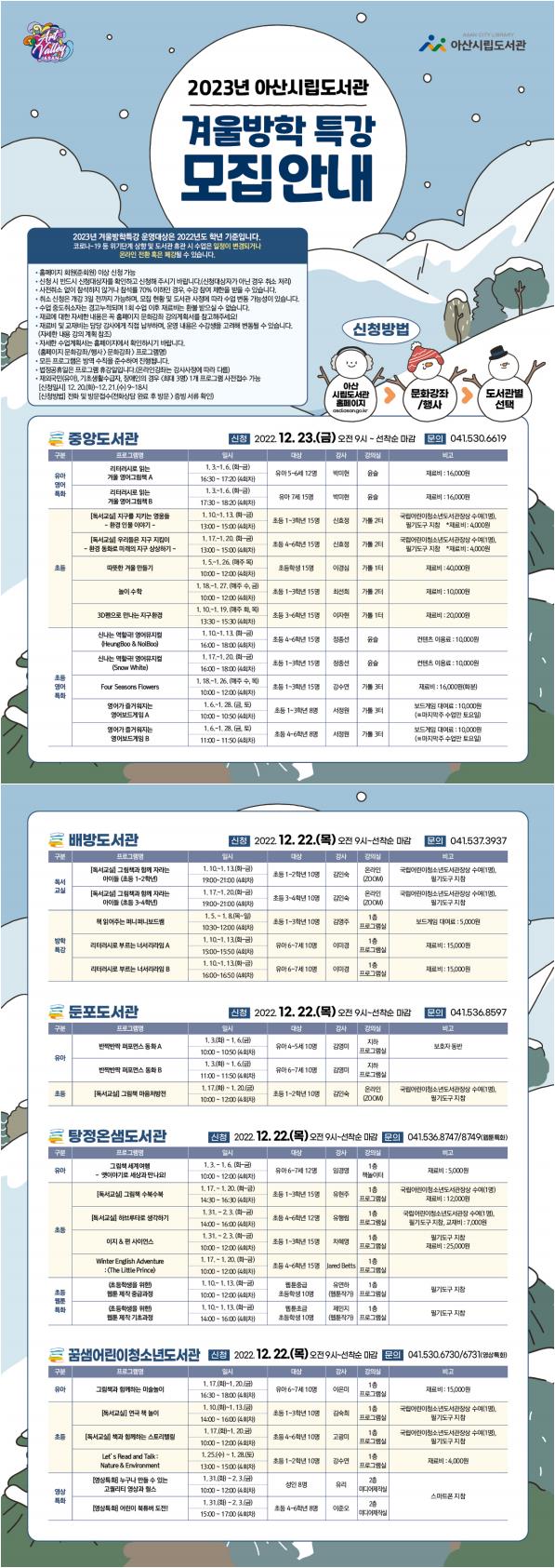 [충청뉴스큐] 아산시가 오는 22일부터 ‘2023년 아산시립도서관 겨울방학 특강’ 수강생을 모집한다.