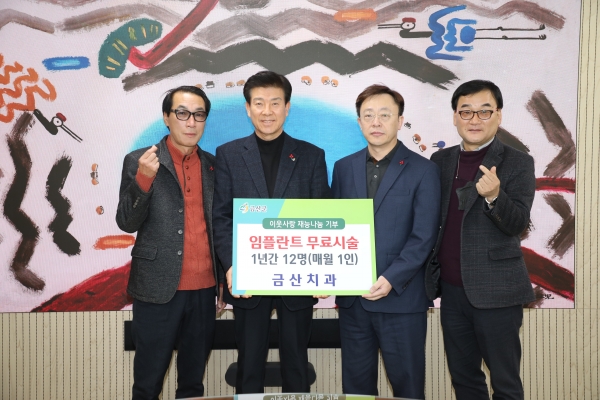 [충청뉴스큐] 금산치과는 지난 14일 금산군을 찾아 경제적으로 힘든 여건에 놓인 금산군 저소득 군민을 대상으로 각 읍면의 추천을 받아 2023년 매월 1명씩 총 12명에게 임플란트 무료시술 지원을 약속했다.