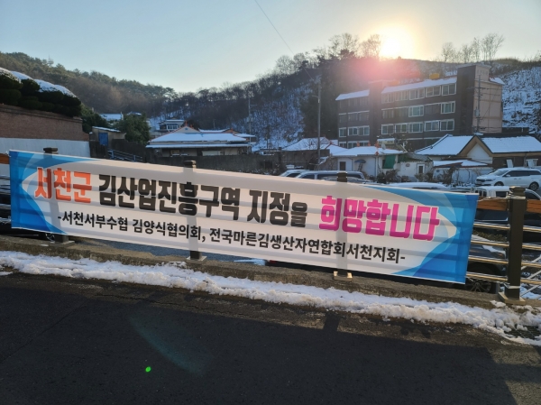 서천군은 최근 한 달간 어업인단체를 중심으로 ‘서천군 김산업진흥구역 지정을 희망한다’라는 문구가 담긴 현수막 릴레이를 전개했으며 지난달 25일 김산업진흥구역 지정 및 발전방안 연구용역을 착수하는 발 빠른 행보를 보였다.