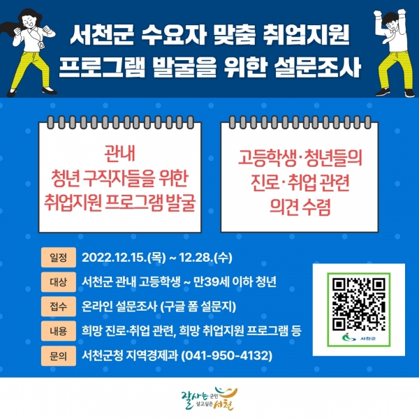 설문 내용은 희망 취업프로그램 희망 직종 진로·취업 선택 가치 희망 급여 수준 등이며 서천군청 홈페이지 공지사항을 참고하거나 포스터에 부착된 QR코드를 통해 참여할 수 있다.