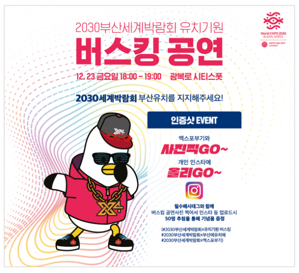 [충청뉴스큐] 부산시는 2022 광북로 겨울빛 트리축제와 연계해 오늘 저녁 6시부터 7시까지 광복로 시티스폿에서 2030부산세계박람회 유치기원 버스킹 공연을 진행한다고 밝혔다.