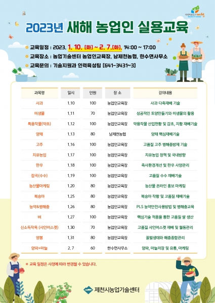 [충청뉴스큐] 제천시는 오는 1월 10일부터 2월 7일까지 총 1,300명을 대상으로 농업기술센터 일원에서 ‘2023년 새해 농업인 실용교육’을 진행한다.