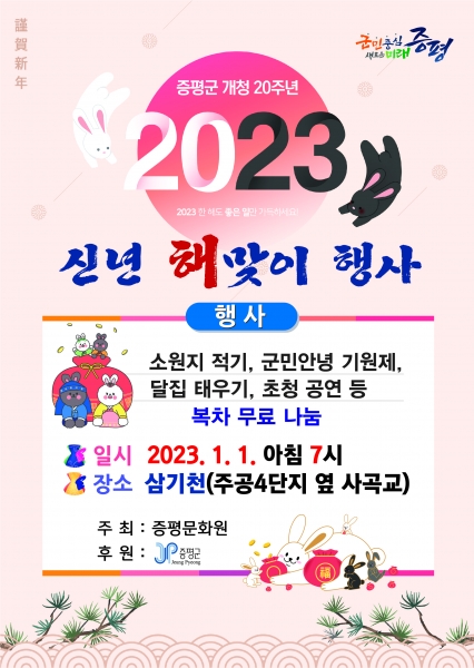 군 관계자는 “군 개청 20주년인 2023년의 희망과 도약을 다함께 기원하고 응원하는 굳은 메시지를 담게 될 것”이라며 주민들의 많은 관심과 성원, 질서 있는 참여 등을 당부했다.