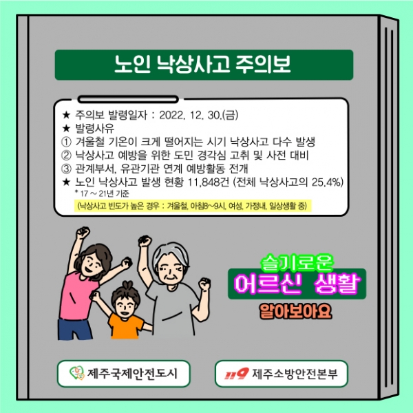 [충청뉴스큐] 제주특별자치도 소방안전본부는 최근 제주에 대설로 많은 눈이 내리는 등 겨울철 추위가 본격화됨에 따라 30일 ‘겨울철 노인 낙상사고 주의보’를 발령한다고 밝혔다.