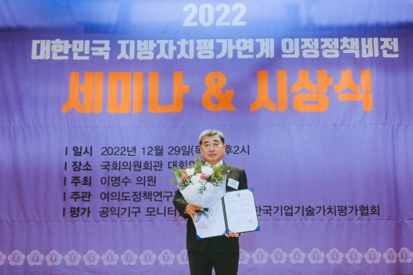 여의도정책연구원이 주관한 ‘지방자치평가 의정정책비전대상’은 지방자치제도 활성화, 주민복지증대, 지역발전 시책추진 등에 공헌한 우수 지방의회와 의원을 선정하는 상이다.