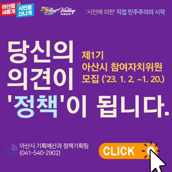 [충청뉴스큐] 아산시가 민선 8기 박경귀 아산시장 취임 1호 결재로 출발했던 ‘아산시 참여자치위원회’ 위원 공개모집에 나서며 시민이 시정에 참여하는 직접 민주주의의 신호탄을 쏘아 올렸다.