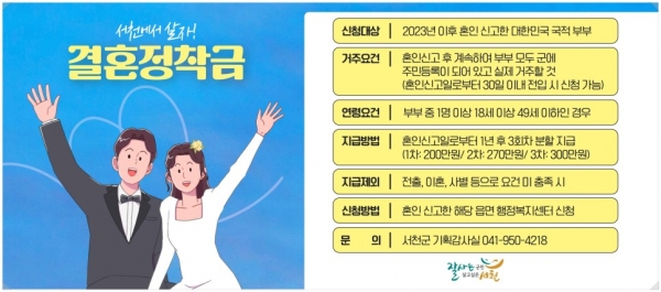 청중장년층의 안정적 정착과 저출산 극복을 위해 추진된 이번 결혼정착금 제도는 지난해 12월 ‘서천군 인구정책 지원에 관한 조례’ 개정을 통해 지원 근거를 마련한 바 있다.