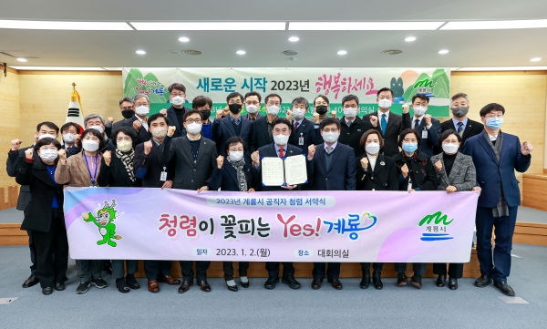 [충청뉴스큐] 계룡시는 2일 시청 대회의실에서 열린 시무식과 함께 계묘년 새해를 맞이해 청렴 실천을 위한 의지를 다지고자 ‘2023년 계룡시 공직자 청렴 서약식’을 실시했다고 밝혔다.