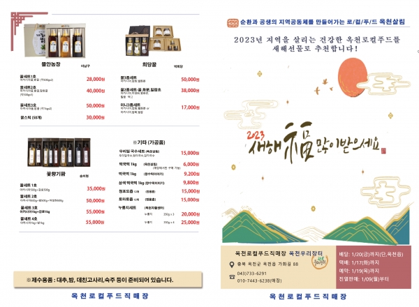 [충청뉴스큐] 옥천로컬푸드직매장에서는 계묘년 새해 민족의 명절 설을 앞두고 오는 9일부터 옥천 로컬푸드 선물세트를 합리적인 가격에 판매한다.