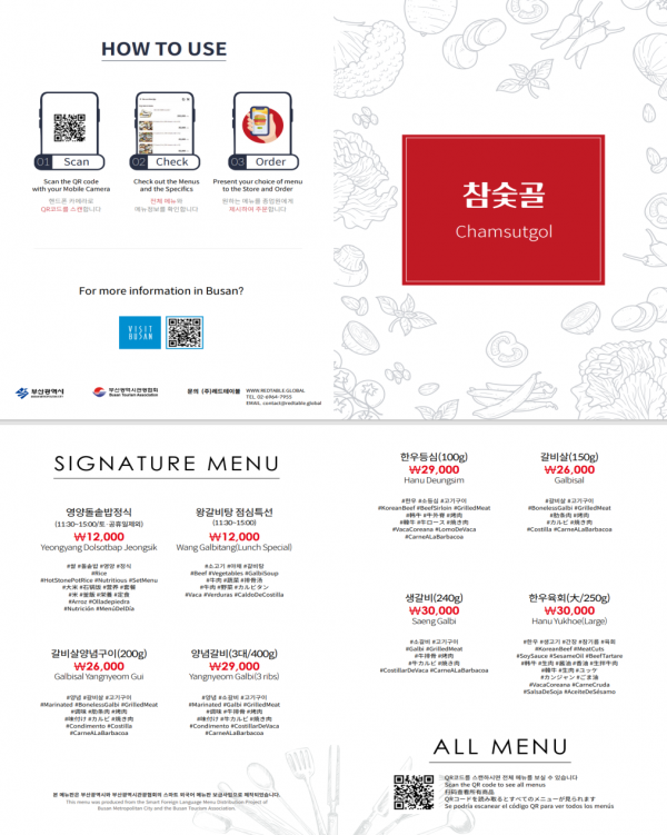 ‘스마트 외국어 메뉴판 보급 사업’이란 부산 주요 관광지 내 메뉴판, 가격표 등 외국어 표기를 표준화하고 QR코드를 활용해 외국인 관광객들의 음식점 이용 등 관광편의를 도모하기 위한 사업으로 문화체육관광부의 공모사업인 국제관광도시 사업의 일환으로 ’22년부터 부산광역시관광협회와 함께 추진하는 사업이다.