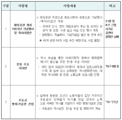 오는 7월에는 각계각층 청년대표로 구성된 ‘한중 우호 카라반’이 중국내 임정 소재지를 열차로 순회방문하면서 한중 양국국민간 다양한 소통교류행사를 진행하며, 올해부터 3개년 사업으로 일본 내 ‘우토로 평화기념관 건립’도 추진한다.