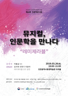 이번 인문학콘서트는 ‘뮤지컬 인문학을 만나다 “레미제라블”’이라는 주제로 오는 3월 26일 저녁 7시부터 9시 인천평생학습관 미추홀에서 개최된다. 영화와 뮤지컬을 통해 많이 알려진 “레미제라블”작품을 통해 시대적 상황 및 작품에 대한 메시지를 배우며 인천시민에게 인문학적 소양을 기르고, 뮤지컬에 쉽게 다가갈 수 있는 기회를 마련한다. 강연과 더불어 뮤지컬 “레미제라블”의 완성도 있는 음악으로 문화공연을 즐기면서 작품에 대한 이해도를 높일 수 있는 시간을 가진다. ‘나만의 파리’, ‘뮤지컬토크2.0’의 저자 이동섭 작가가 인문학 강의를, 성악가 3인이 레미제라블 OST공연을 함께 진행한다.