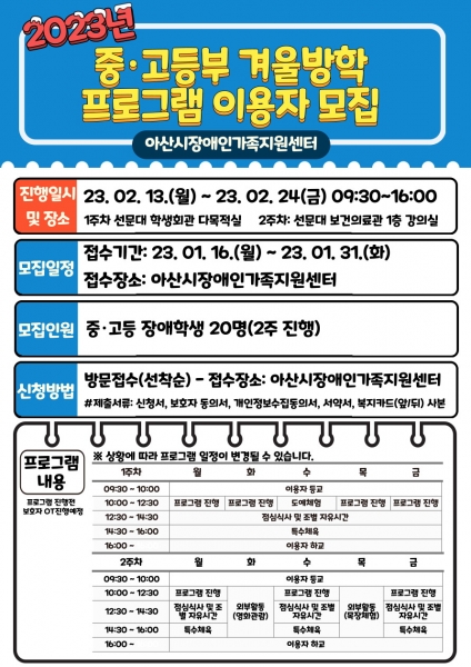 [충청뉴스큐] 아산시장애인가족지원센터가 16일부터 2023년 장애 학생 겨울방학 프로그램 참여자를 모집한다.