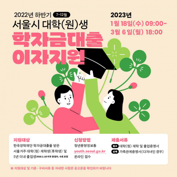 [충청뉴스큐] 서울시가 2022년 하반기에 발생한 학자금 대출이자를 지원한다.
