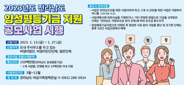 [충청뉴스큐] 전라남도는 오는 27일까지 양성평등 문화 확산과 여성의 사회 참여 확대 및 권익 증진을 위한 ‘양성평등기금 사업’을 공모한다고 밝혔다.
