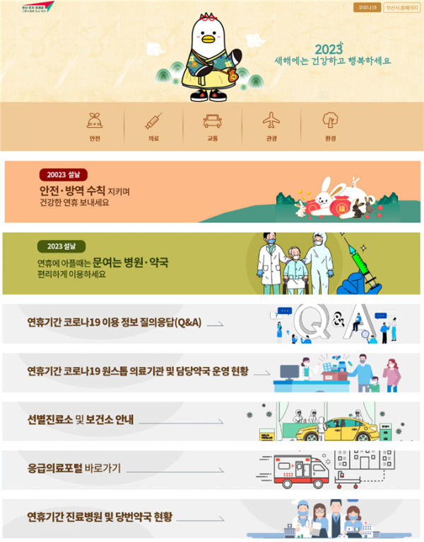 한편 설 연휴 기간 코로나19 이용 정보, 원스톱 진료기관 및 담당약국 운영 현황 등에 대한 세부사항은 부산시 누리집 ‘설 연휴 생활정보 안내 사이트’또는‘코로나19 사이트’를 통해서 확인할 수 있다.
