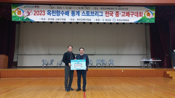 [충청뉴스큐] ‘2023 옥천향수배 동계 스토브리그 전국 중·고배구대회’ 마지막 날인 지난 19일 한국 중·고배구연맹 조길현 총무이사가 옥천에 고향사랑기부금 100만원을 납부했다.