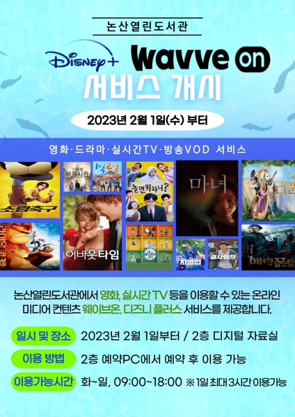 이에 따라 오는 2월부터 논산열린도서관에서 20만 편 이상의 국내외 영화, 드라마를 비롯해 실시간TV 시청까지 가능한‘웨이브온’서비스를 즐길 수 있게 된다.