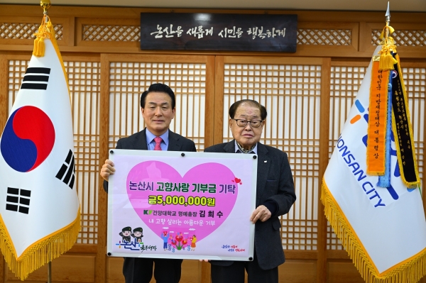 [충청뉴스큐] 건양대학교의 설립자 겸 명예총장이자 건양의료재단 김안과병원의 이사장인 명곡 김희수 박사가 지난 30일 고향 논산에 ‘고향사랑기부금’ 500만원을 전했다.