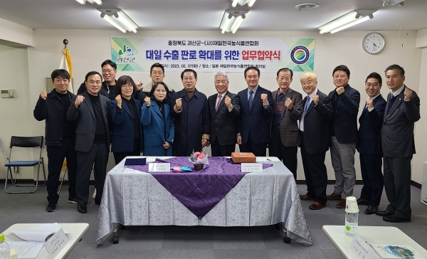 지난 7일 도쿄 재일한국농식품연합회 회의실에서 송인헌 괴산군수, 김규환 회장을 비롯해 관계자 17명이 참석한 가운데 괴산군과 재일한국농식품연합회 간의 농식품 수출 확대를 위한 업무협약을 체결했다.