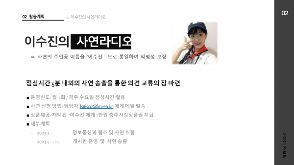 슈퍼주니어보드는 조직문화개선의 지름길로써 유연한 의견수렴 확립을 제시하며 이수진의 사연라디오 충주시 friendly 소통광장 충주시 근황올림픽 점심도 업무분장이 되나요? 내가 제일 잘 나가 존중하는 조직문화 10계명 포스터 충주시 상상유니브 등 7가지 프로그램을 제시했다.