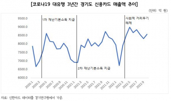 경기연구원은 2020년 1월 1일부터 2022년 10월 31일까지 경기도 소재 신용카드 오프라인 가맹점의 일자별 매출액 추정치 자료를 활용해 코로나19 대유행이 3년간 코로나19 확산으로 영향받은 경기도 소상공인들의 매출 변동을 종합적으로 점검한 ‘코로나19 대유행 3년, 경기도 신용카드 매출 동향과 시사점’ 보고서를 발간했다고 14일 밝혔다.