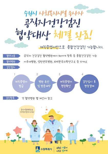 수원시는 ‘공직자 종합건강검진’ 협약 대상에 사회복지시설 종사자를 추가해 올해부터 확대된 항목으로 검진을 받을 수 있게 했다.