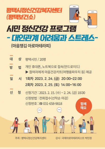 참여를 원하는 시민은 평택시정신건강복지센터에 전화로 신청할 수 있으며 이 외에도 우울, 불안 등으로 어려움을 겪는 시민 누구나 문의해 도움을 받을 수 있다.