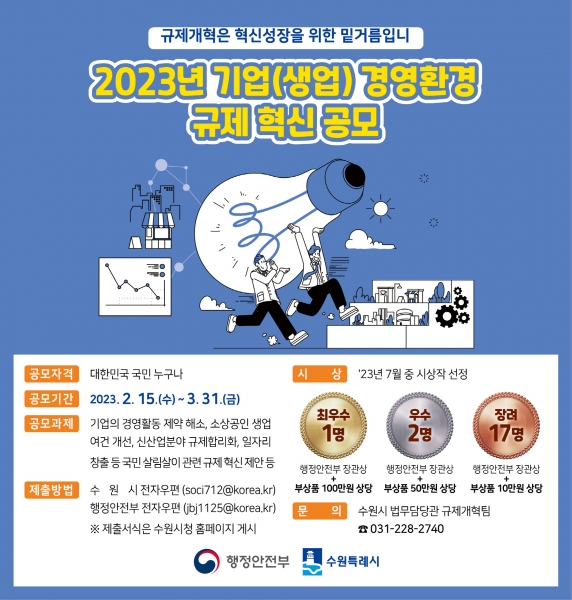 수원시는 행정안전부와 공동으로 ‘2023년 기업 경영환경 규제 혁신 공모전’을 진행, 오는 3월31일까지 제안을 접수받는다.
