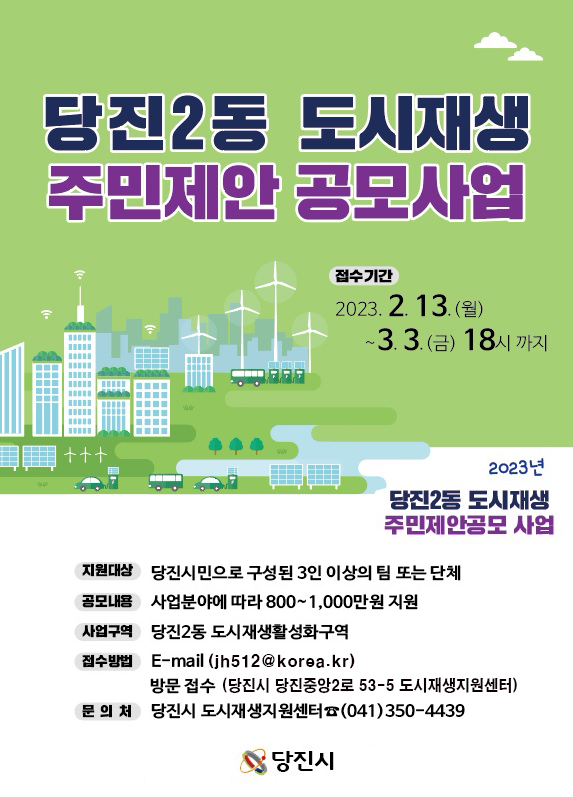[충청뉴스큐] 당진시가 3월 3일까지 당진시민을 대상으로 당진 2동, 합덕읍, 송악읍 도시재생 주민 제안 공모사업 참여자를 모집한다.