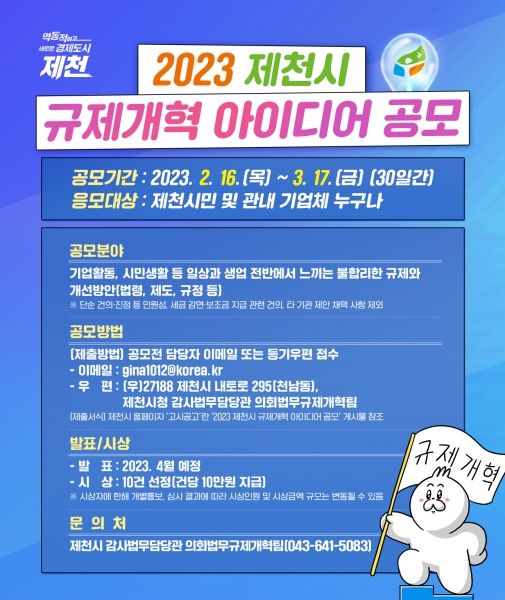 [충청뉴스큐] 시는 불편을 끼치는 불합리한 규제를 발굴하고 규제개혁에 대한 시민 체감도 향상을 위해 ‘2023 제천시 규제개혁 아이디어 공모’를 추진한다.