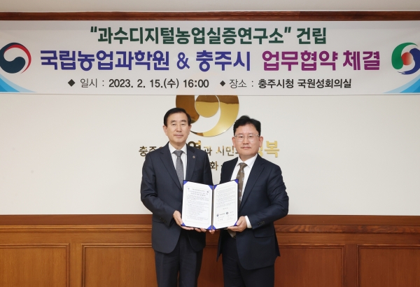 [충청뉴스큐] 충주시는 15일 농촌진흥청 국립농업과학원과 농촌진흥청이 새롭게 구축하는 ‘과수디지털농업실증연구소’ 건립을 위한 업무협약을 체결했다고 밝혔다.