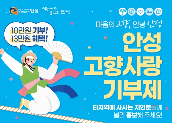 모아진 고향사랑기부금은 사회적 취약계층 지원, 청소년 육성 및 보호, 지역주민의 문화·예술·보건 증진, 지역공동체 활성화 등 안성시 지역발전에 사용될 계획이라고 전했다.