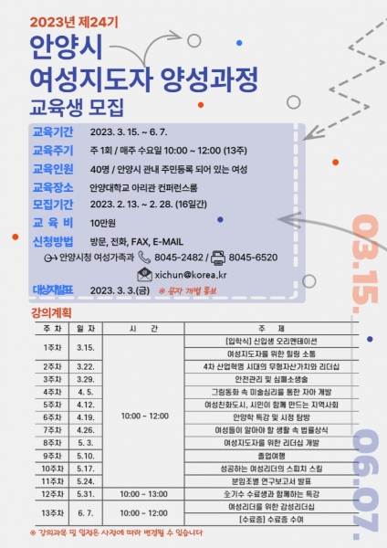 [충청뉴스큐] 안양시는 잠재력 개발과 리더십 역량 강화를 통해 시와 함께 성장할 사회 각 분야의 우수한 여성리더를 양성하고자 ‘제24기 안양시 여성지도자 양성과정’ 교육생 40명을 모집한다고 16일 밝혔다.