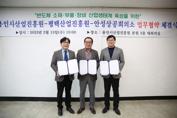 [충청뉴스큐] 평택산업진흥원과 용인시산업진흥원 및 안성상공회의소는 지난 15일 용인시산업진흥원 대회의실에서 반도체 소재·부품·장비 산업생태계 육성을 위해 업무협약을 체결했다고 밝혔다.