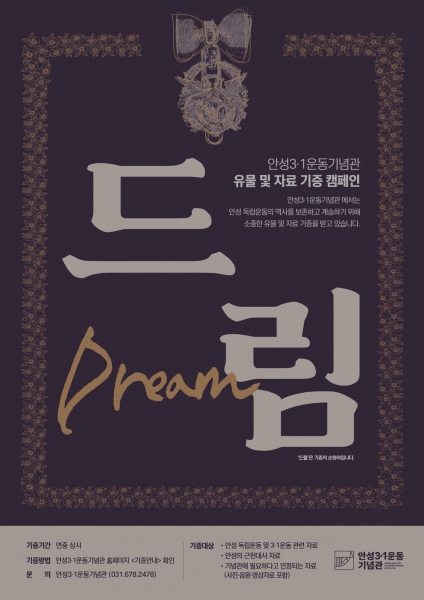 [충청뉴스큐] 안성3.1운동기념관에서는 안성 독립운동의 역사를 보존하고 계승하기 위해 유물 및 자료 기증 캠페인 ‘드림’을 펼친다.