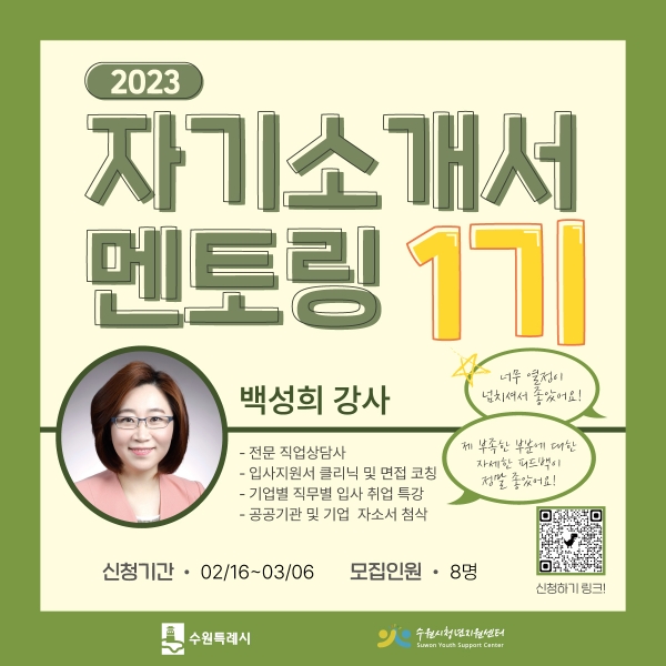 [충청뉴스큐] 수원시청년지원센터가 자기소개서 멘토링·진로설계 프로그램에 참여할 구직 청년을 3월 6일까지 선착순으로 모집한다.