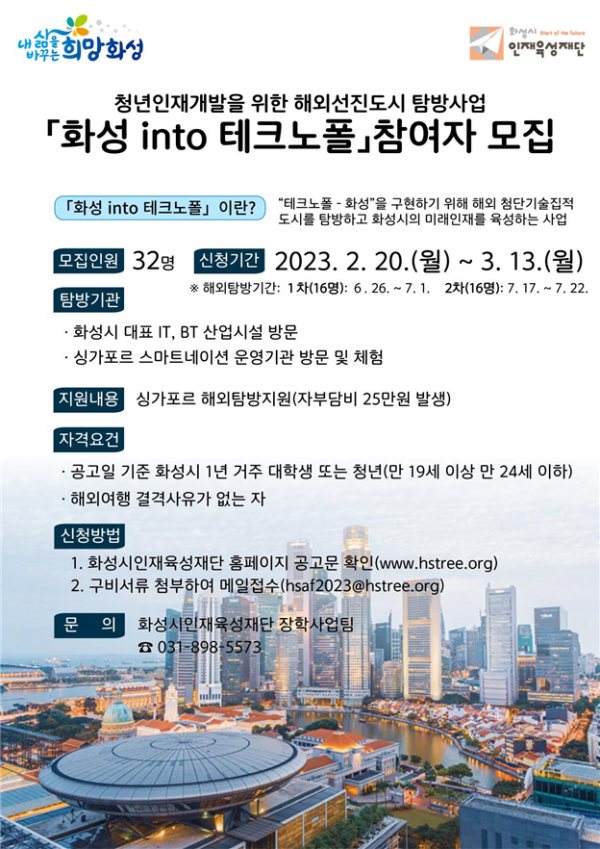 [충청뉴스큐] 화성시인재육성재단이 해외 첨단산업 도시 탐방 프로그램 ‘2023년 화성 into 테크노폴’에 참여할 지역 청년을 모집한다.