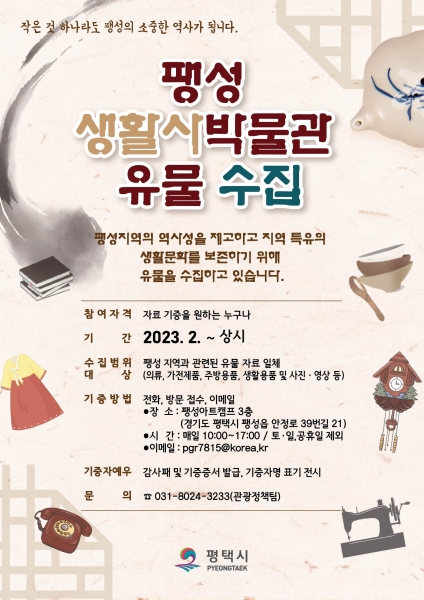 수집 대상 유물은 팽성지역 사람들의 삶을 엿볼 수 있는 주방용품, 가구, 사진·영상, 서적 등 주민들의 손때가 묻은 생활 속 물품이며 기증자에게는 기증증서와 감사패를 수여하고 기증유물은 팽성 생활사박물관에 기증자 명을 표기해 전시될 예정이다.