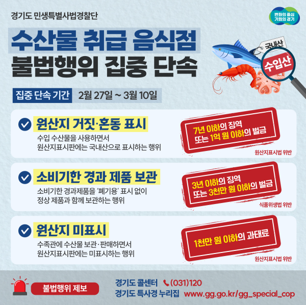 [충청뉴스큐] 경기도 민생특별사법경찰단이 2월 27일부터 3월 10일까지 도내 수입 수산물 취급 음식점 360개소를 집중 단속한다.