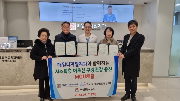 [충청뉴스큐] 안성시 안성3동주민센터와 안성3동지역사회보장협의체, 매일디지털치과의원 은 지난 2월 21일 “저소득층 어르신 구강건강 증진” 관련 활동을 명시한 업무협약을 체결했다.