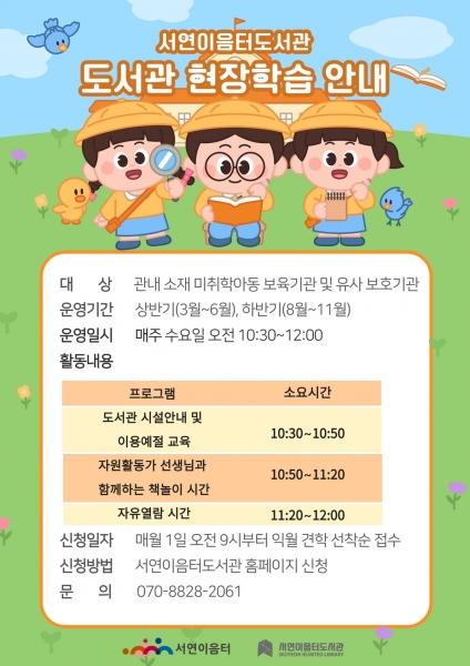 신청은 서연이음터도서관 홈페이지를 통해 온라인으로 가능하며 매월 1일 오전 9시부터 다음 달 현장학습을 선착순으로 접수할 수 있다.